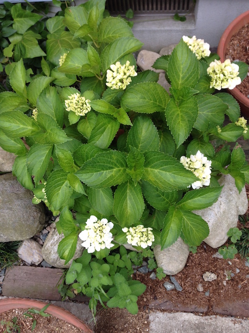 昨年、京都のお客様から白い紫陽花の鉢植をいただきました。大きな白い花が素敵で、、、(白色、大好きです)印象的だったので、来年は、アトリエの庭に咲いて欲しいとの願いを込め植え替えました。