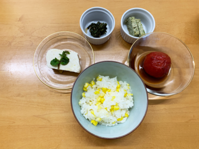この日の私の夕食。トウモロコシご飯以外は、「こちょこちょ時間」で作って保存してあった作り方のシンプルなものばかり。