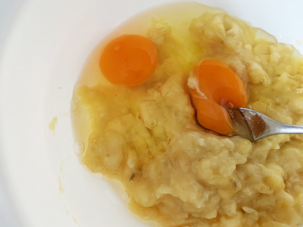 まずバナナ、、、皮がついたままでグチャグチャに潰すと楽です。