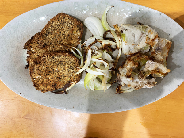 右は、同時に玉ねぎを焼いたもの、、、甘くて美味しい。その隣は、長芋に椎茸とカタクリを入れて適当に焼いたもの、、、これは少々微妙だった。笑