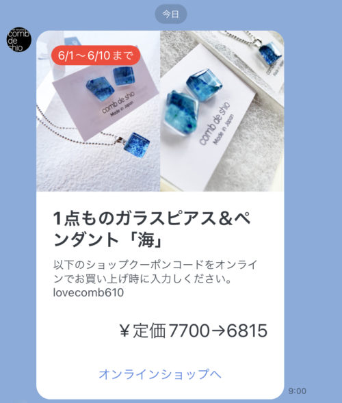 そこで、comb de shioガラスの美しさを見ていただくと共に感謝の気持ちもお伝えできるようにお値引きのお品をLineにてお届けしようと思いました。(少しですいません!)