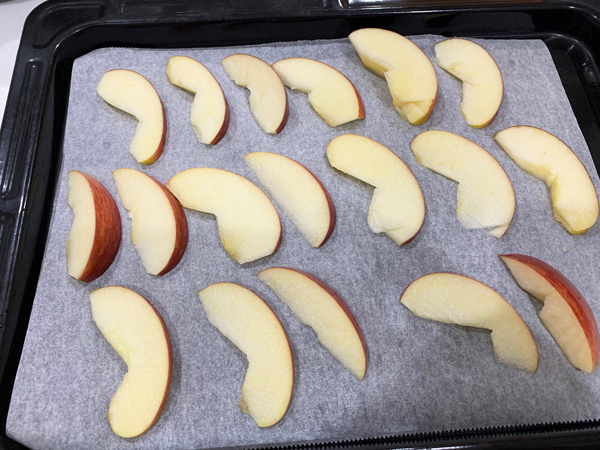 リンゴを丸ごと焼くのは時間がかかるので、薄めにカットしてオープンに入れた。