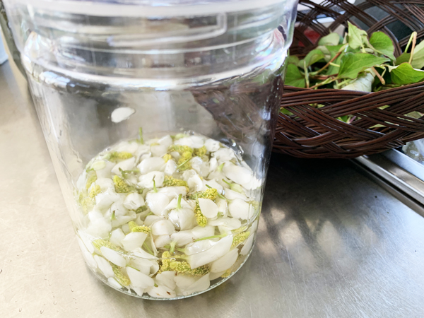 ドクダミの花で、化粧水も作りました。今、朝晩使っていますが、なんかいい感じですよ!虫刺されにも効く気がするし、まさに十薬です。