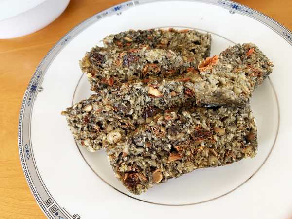 オートミールパン オートミール、アーモンド、干しぶどう、黒胡麻ラテ、トマトの皮(ラタトゥーユで使ったトマトの皮)を入れてみた。