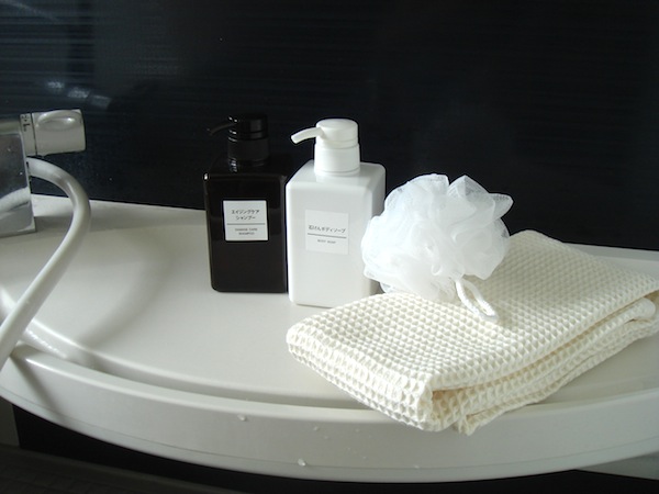 実は、これ「無印」グッズです。容器もラベルもとてもシンプル。バスタオルもミニバスタオルに変えました。