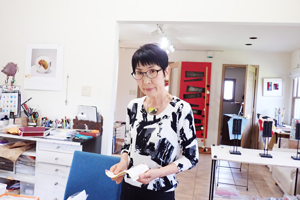 ニットに合わせて。この日はアトリエで大掃除(なので、背景が散らかっていてすみません!)
