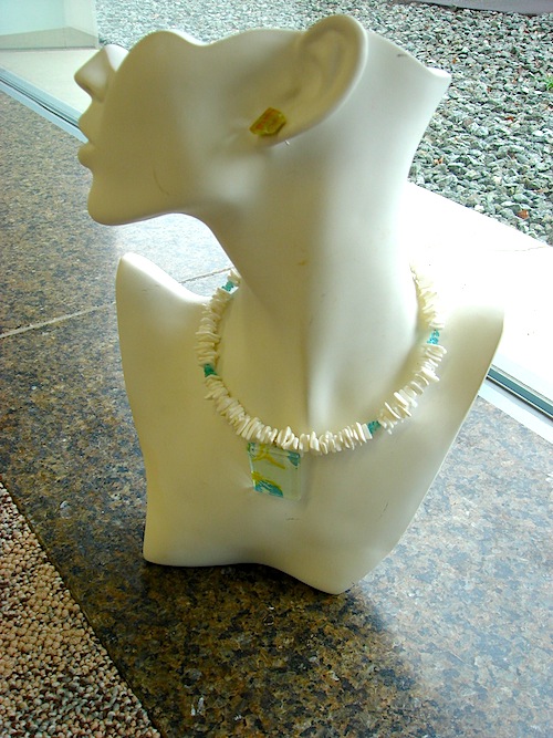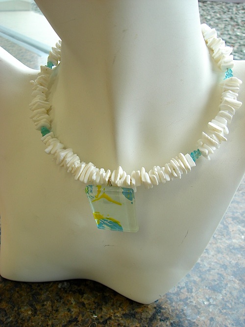 さて、今日は、涼しげなアクセサリーをご紹介します。ガラスと貝のコラボのチョーカーです。