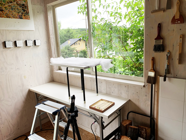 まだ、オンラインショップには、掲載できていないけれど、アトリエでの雨の日の一コマです。