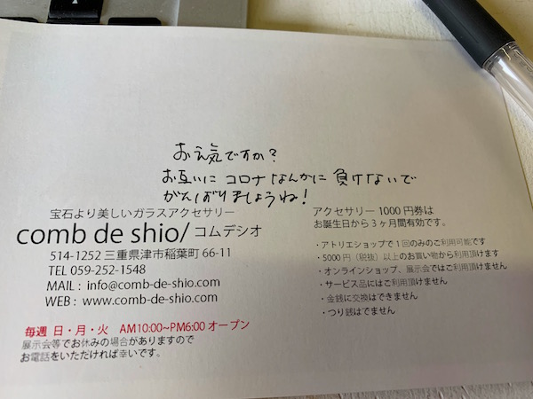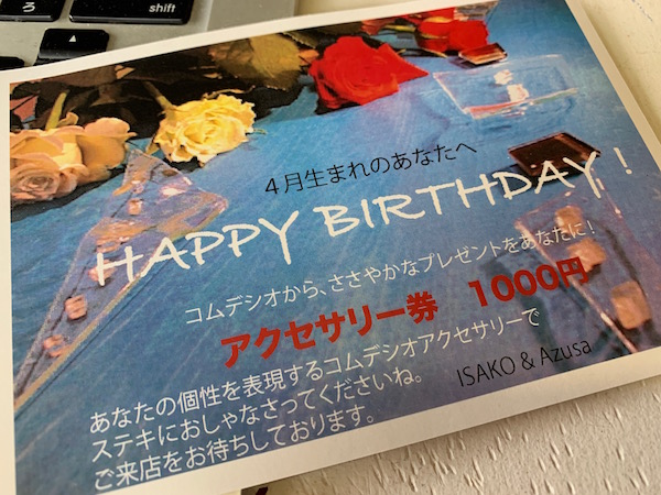 コムデシオは、アトリエに来られるお客さまに毎月お誕生日のハガキを出していて、ちょうど今、その準備途中だったので、思わず、、、私は、