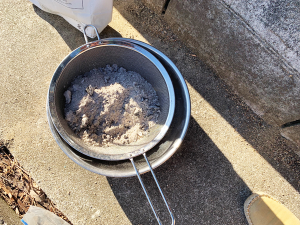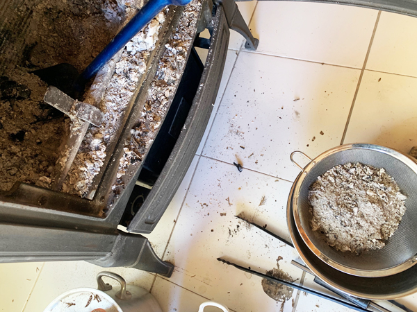 先ずは、綺麗な灰作りから、、、薪ストーブでできた灰をかき集め、ザルで綺麗に漉しています。