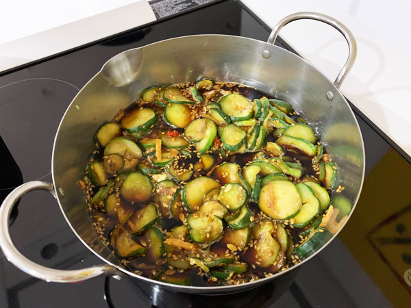 - これをきゅうりと共に鍋に入れ、一煮立ちする。