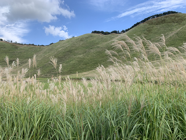 『曽爾高原はススキで一面に覆われた草原で、3月中頃に毎年山焼きが行われ、春から夏にかけては一面に青い絨毯が敷かれたような爽快な姿を見せ、秋にはススキの穂が陽射しを浴びて銀色・金色に輝き、毎年たくさんの観光客が訪れます。』
