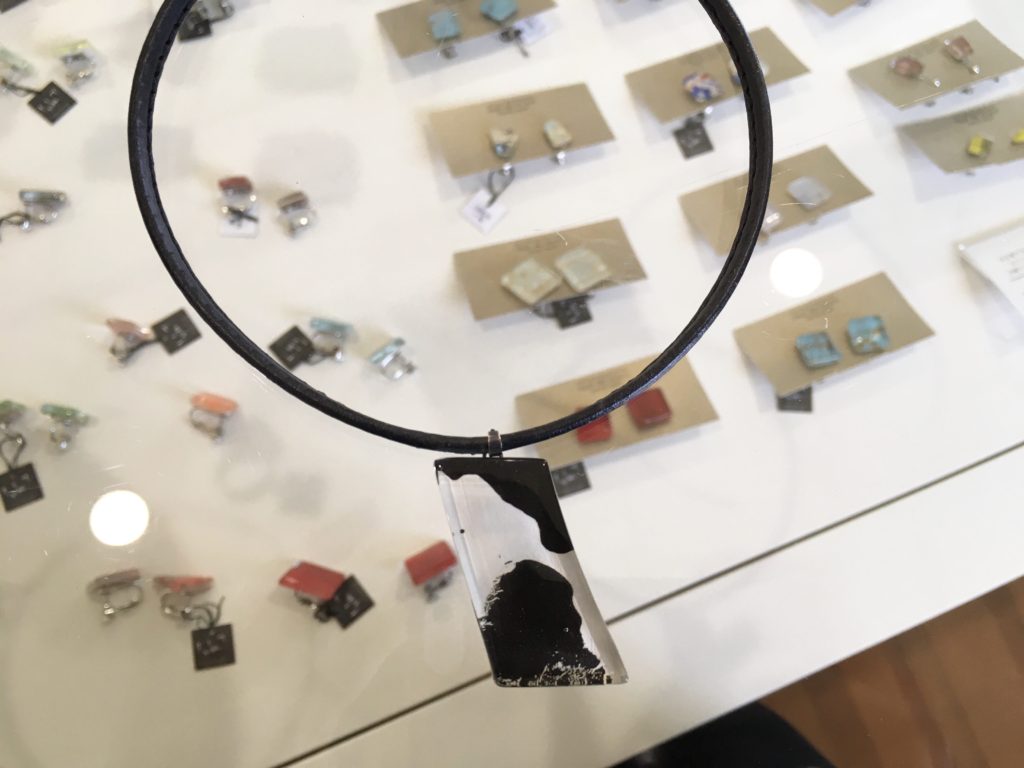 私の焼成したガラスに革を合わせるととてもカジュアルになって、普段着のおしゃれにとてもいい。それに着けやすくしないと、めんどくさい。後ろの留め金で留めるのは、イヤ。人からの目線を上部に持っていきたい、、、などなどで作り始めました。