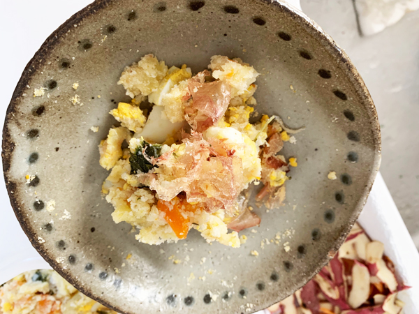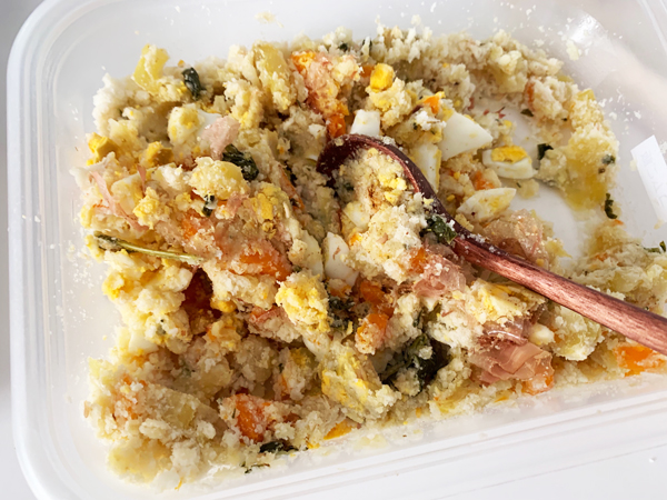 これに、塩、胡椒やマヨネーズで味を付けると、、、栄養満点のおからorポテトサラダになりました。