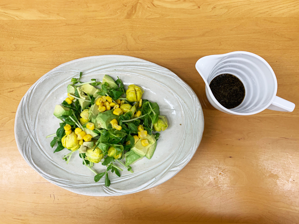 今日は、残っていた野菜にこのドレシングでいただきます。芽キャベツもいつの間にか黄色になってしまいました。