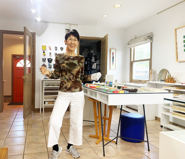 「実は、ガラスが大好きで、この前も小樽でガラスを見たけれど、可愛すぎて、洋服に似合わない。でもコムデシオさんのガラスは、大人のガラス、、、今まで見てきたガラスと全く違うのがオンラインの写真で分かったの」