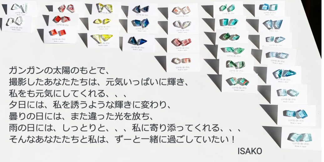 本人曰く「面倒臭がり屋のおしゃれさん」。ガラスの美しさに留まらず、簡単に、楽に着けられるアクセサリーへの配慮やアイデアも、Isakoの作り出すアクセサリーの人気の理由のひとつ。