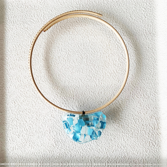 ガラスの透明感と、空のようなブルーが胸元にきらり。