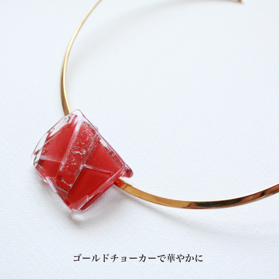 ゴールドチョーカーによく似合うのは、何と言っても赤系ガラストップや濃い目のガラストップでしょうか。