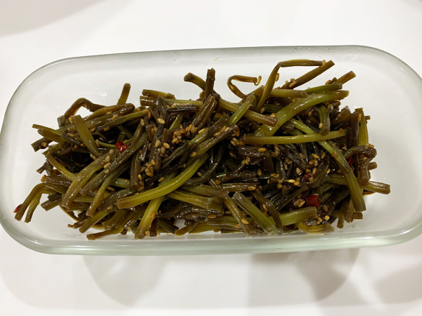 これをさーっと湯がいて、胡麻油で炒めて、醤油、みりん、鷹の爪、胡麻で味付け、汁がなくなるまで煮詰めました。